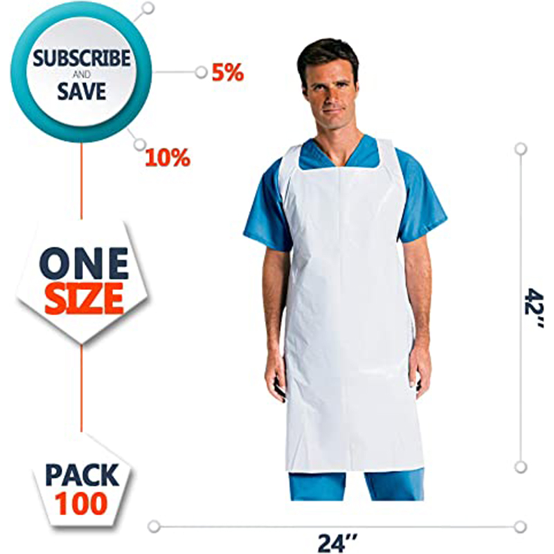 • LOW-COST: Our disposable polyethylene aprons provide cost-effective protection. Wear once and throw away. However this water-resistant apron is sturdy enough to be reused. Our budget disposable aprons are made from 1 Mil thick polyethylene material that keeps costs down while affording protection from water based liquids. These lightweight plastic workwear are your economical choice when it comes to safety aprons.